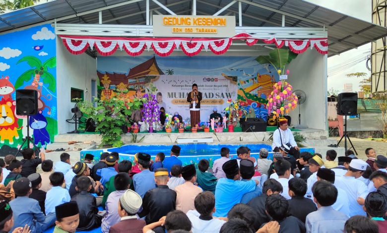 INTERKINI.CO, TARAKAN – Sekolah Dasar Negeri (SDN) 050 Kota Tarakan, Provinsi Kalimantan Utara, menggelar peringatan Maulid Nabi Muhammad SAW di halaman sekolah pada Sabtu (20/9/2025). Kegiatan ini diikuti lebih dari 600 murid dari kelas I hingga kelas VI, bersama dewan guru serta staf sekolah.